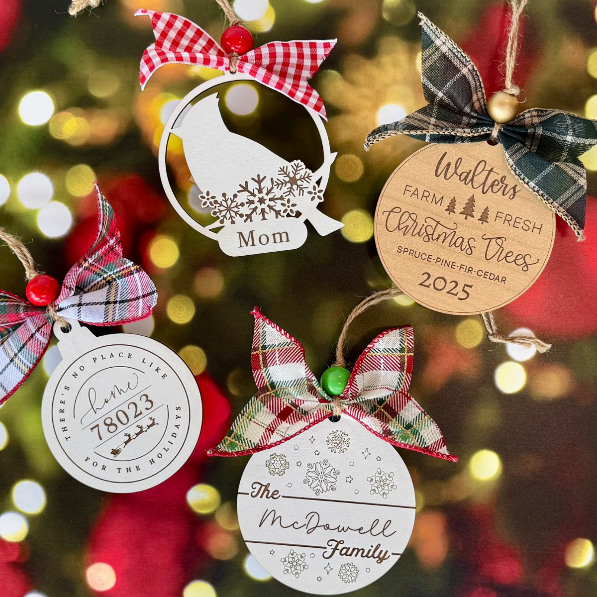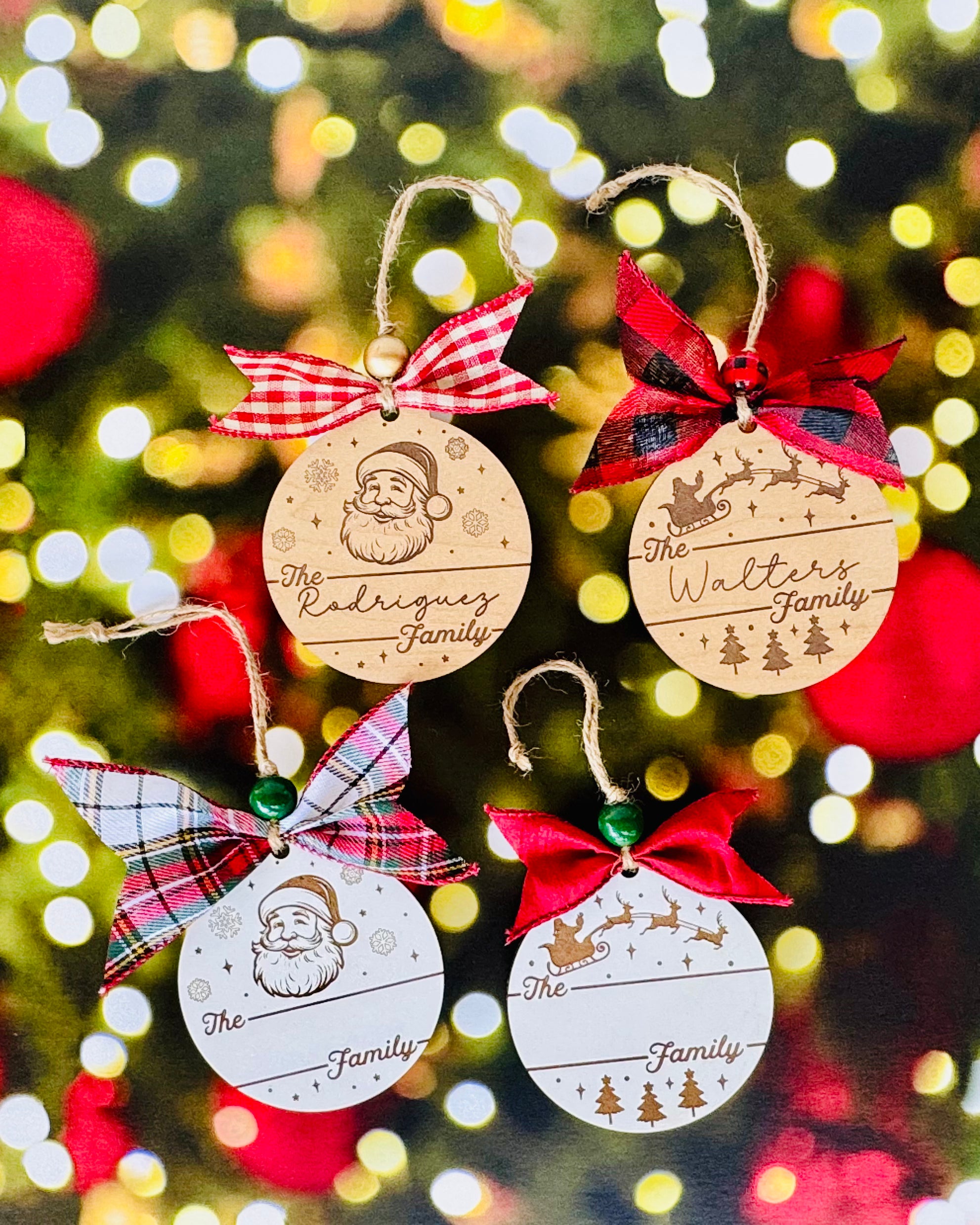 Celebrate togetherness with our Family Collection ornaments, featuring classic round designs personalized with your family name. Choose from festive patterns like Santa, reindeer and sleigh, or snowflakes — each finished with a coordinating plaid or ribbon bow for that cozy Christmas charm.